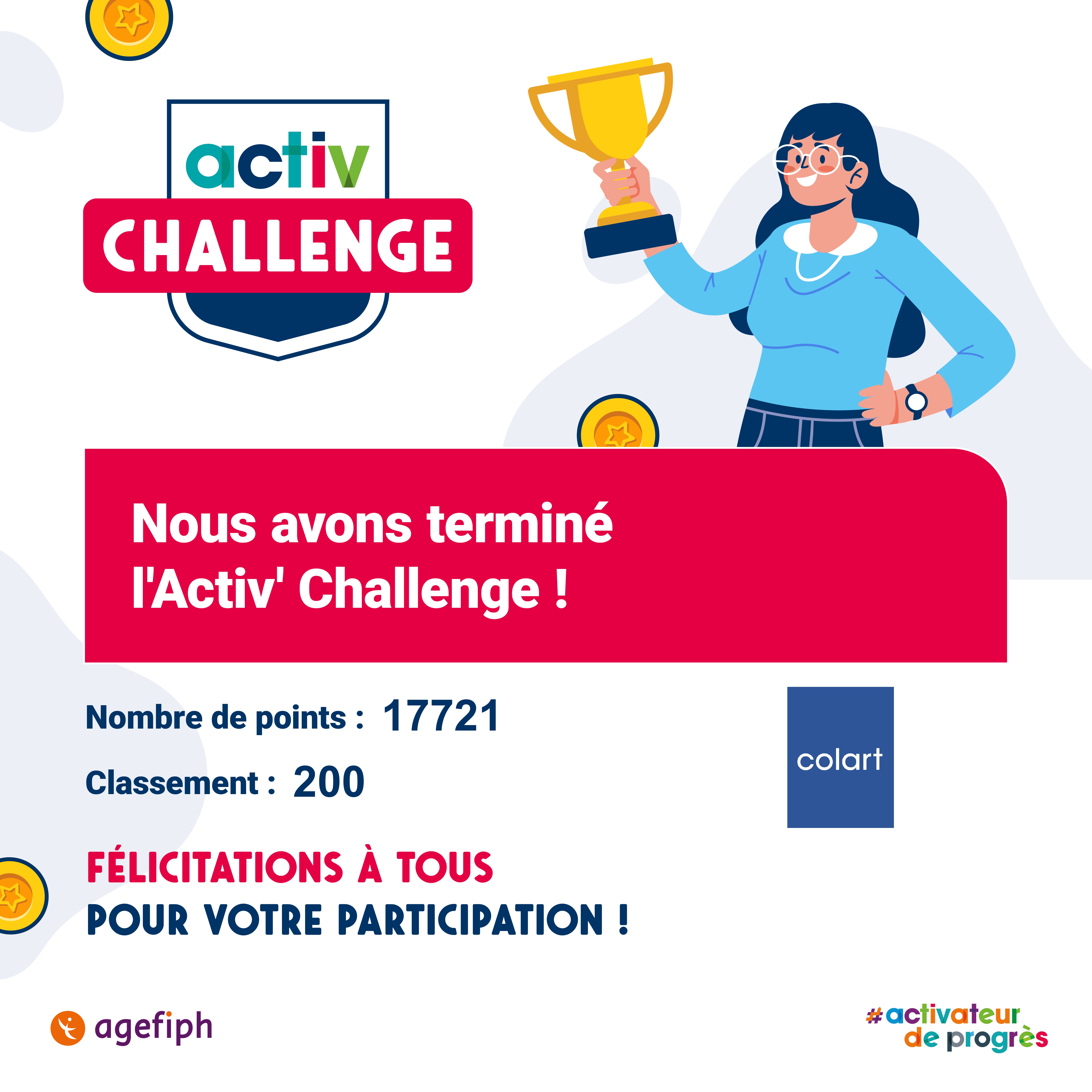 The Wall 1 year, 9 months agoL’Activ’Challenge est un défi pour sensibiliser les salariés au sujet du handicap et l’emploi. Pour notre première participation, Colart est arrivé à la 200e place sur 970 sociétés inscrites.