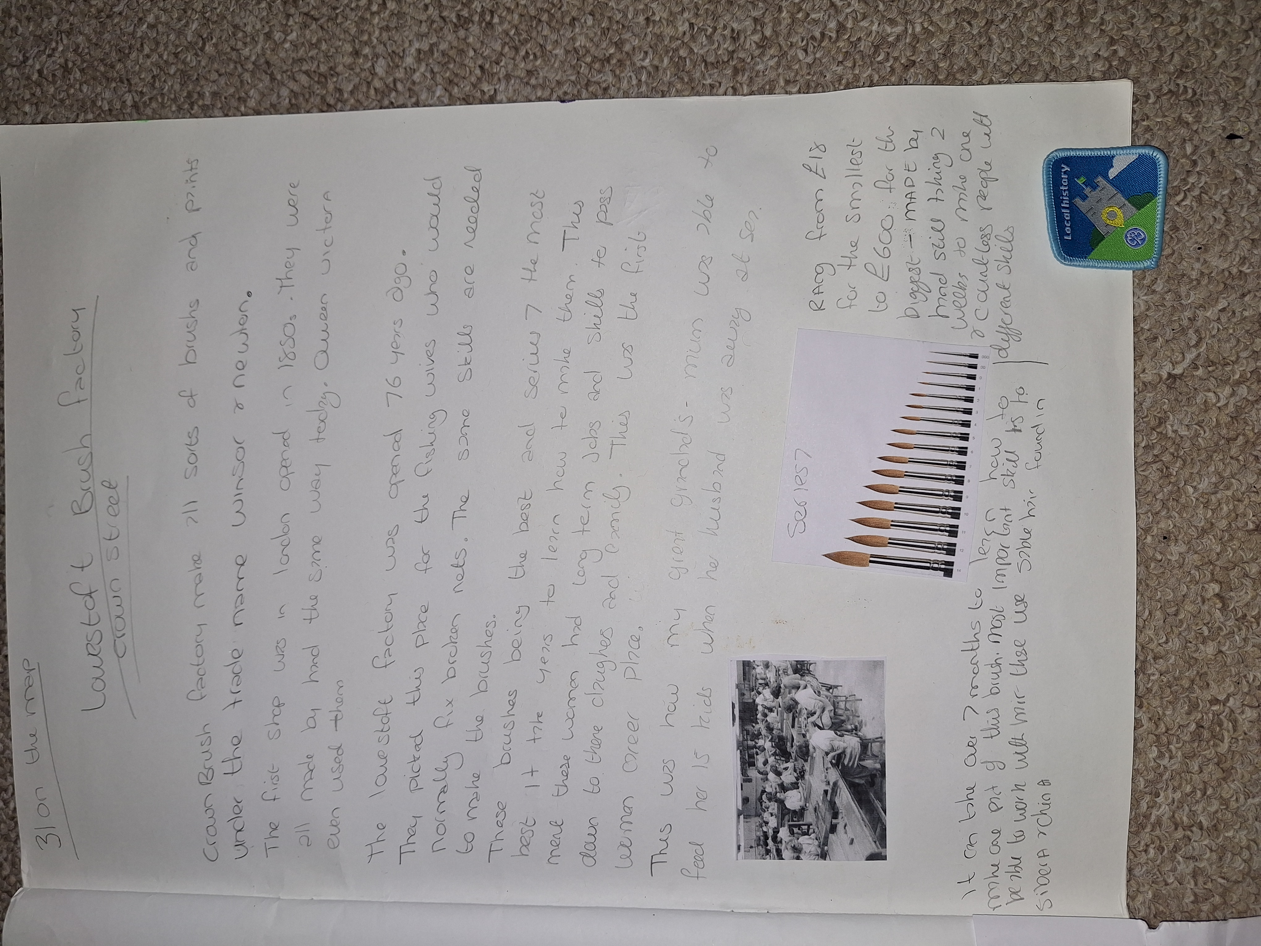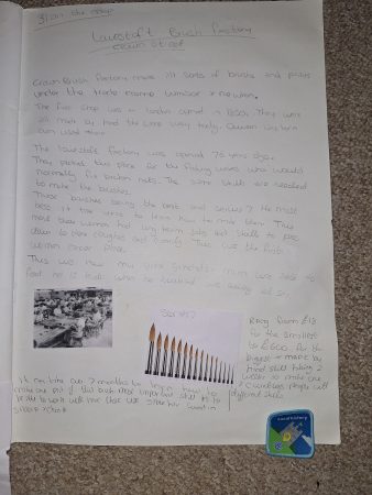 I would like to share a short story and badge about the Lowestoft Brush factory, written by Sapphire-Elysia little school girl, who is a Brownie. She is aware of our brush factory through her great-grandmother, who worked at the brush factory many years ago.