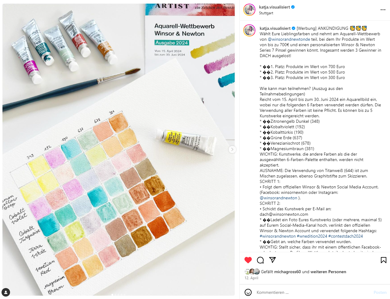 Artists can enter a watercolour contest by submitting up to 5 artworks using at least one of the 6 colours in the palette. Participants in each country can win W&N products worth up to €700. One winner from all countries will also have the chance to win a personalised Winsor & Newton Series 7 brush.