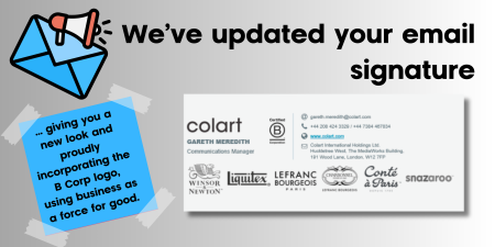 The new email signature is quite chunky. I appreciate that we have brands to be proud of, but I would almost be tempted not to have them here and just keep the top section, which already has the Colart and B Corp logos. The top 50/50 section with the key contact info looks modern and fresh, trying to include the brand logos as well makes it look a bit clunky in my view. …