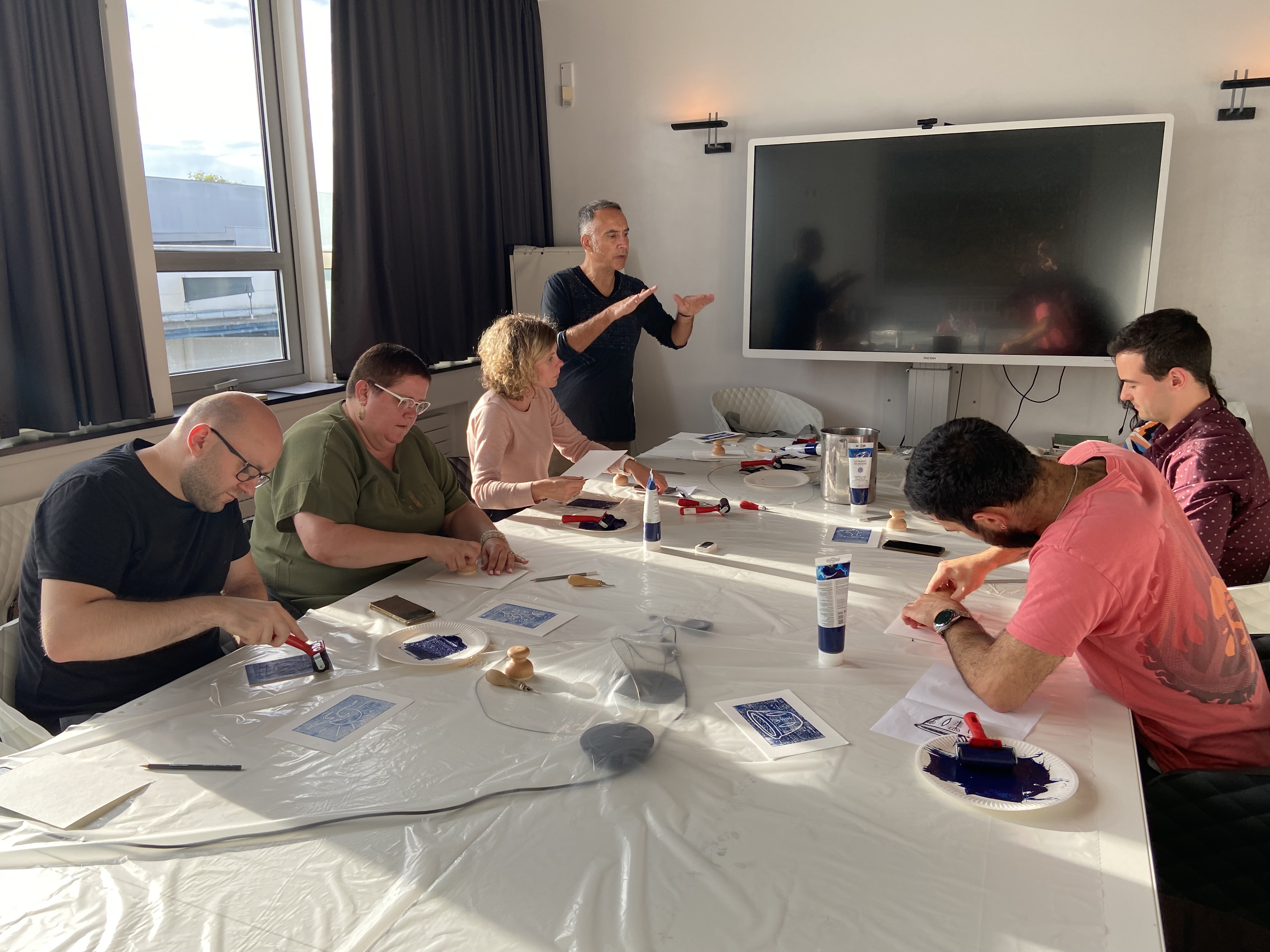 Laurent BLANDIN, artiste rรฉsident, a proposรฉ un atelier formation sur la technique de la gravure et plus prรฉcisรฉment comment rรฉaliser une estampe ร lโencre linogravure Lefranc Bourgeois.