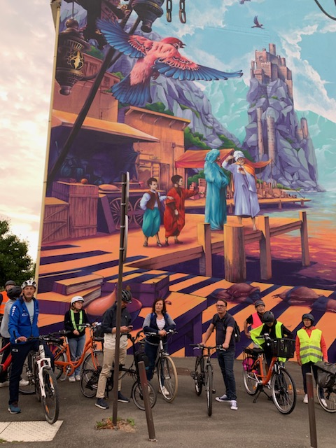 Among them, a bike ride after the work day until nightfall was organized on Tuesday. This 10 km guided bike ride allowed the fifteen people from Colart to discover the works of street-art in Le Mans, with magnificent frescoes all along the route.
