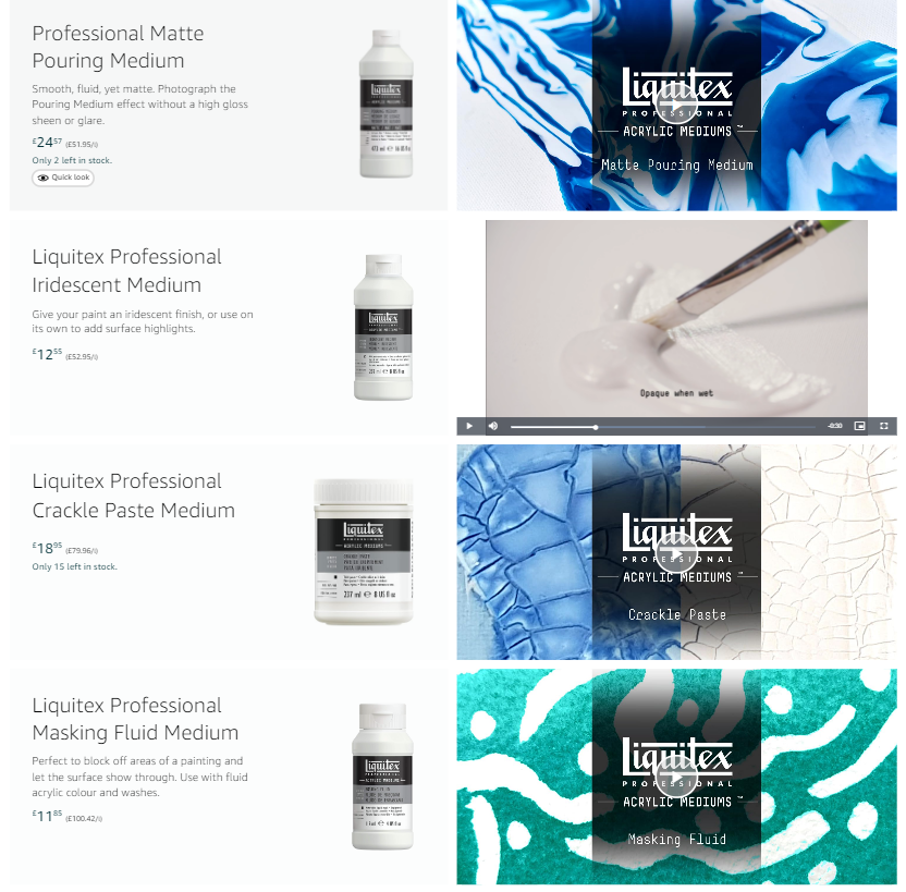 Demystifying products: With selling large, varied ranges such as mediums (one of the top-selling brand store categories), educating and inspiring customers to try a new product is important. To demystify the mediums, video thumbnails illustrating their textures have been added, to prompt more clicks on the incredible videos of their applications.