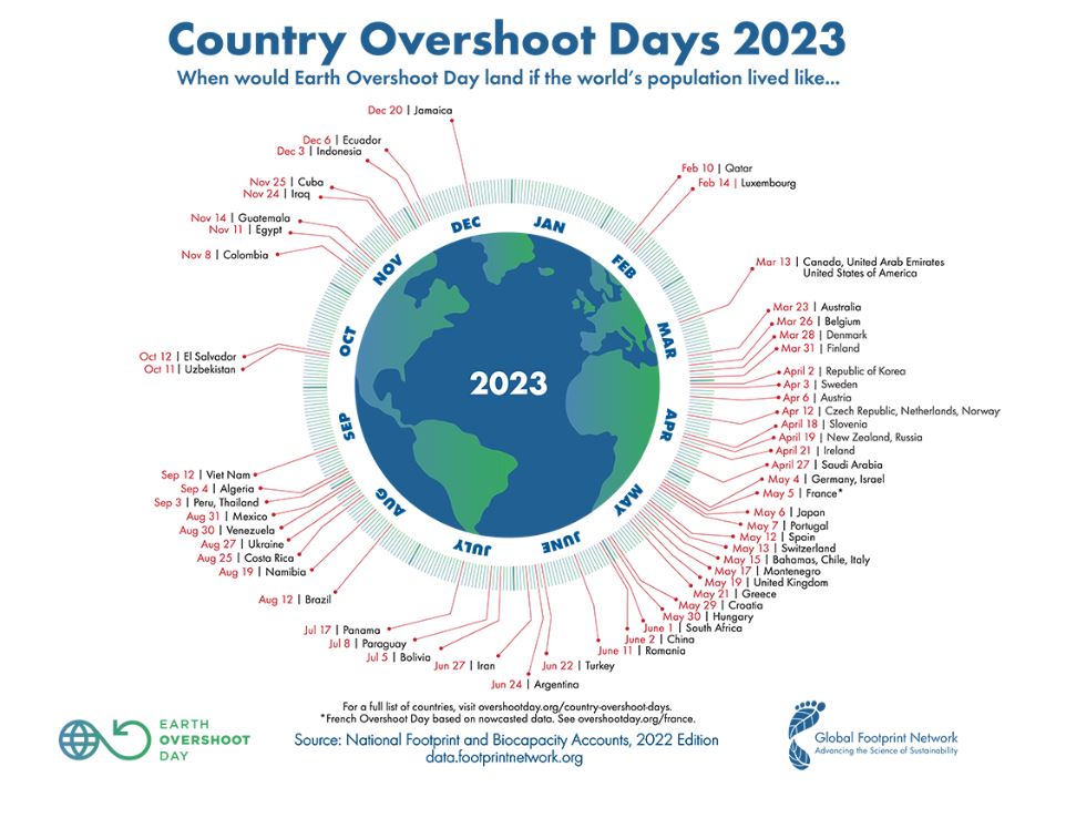 This is when humanity’s ecological demand exceeds the Earth’s capacity to regenerate its resources for that year. It represents the point at which we start living beyond the planet’s ecological means. Some countries are managing to use natural resources at sustainable levels, others not so much….