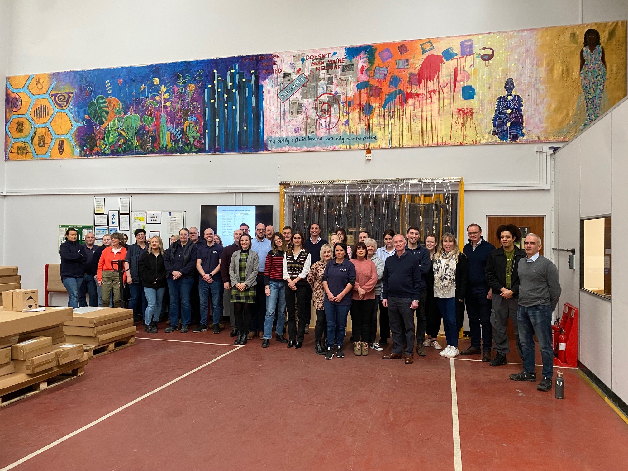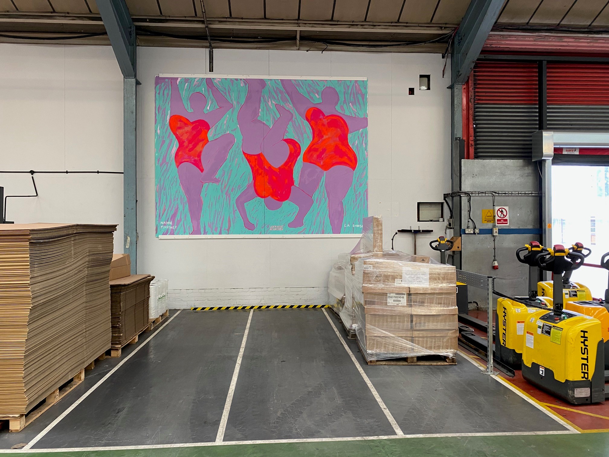 The Wall 2 years, 9 months agoIn line with our UK DC goal to become a local, cultural centre of excellence, the installation of some amazing artwork is helping us to achieve our aims. Our latest addition is the fabulously eye-catching piece by Nadine Mahoney, using LeFranc Bourgeois Flashe paints. In Nadine’s own words, she “finds inspiration through a transformed sense of touch in an increasingly digitized world. Exploring the intersection of technology, gender and human connection, the imagery focuses on feminine forms delving into various aspects of the female experience.” La Danse is the epitome of her artistic aspirations and the Nana figures were ideal for the scale of this piece, which measures an impressive 408 x 304cm and evokes a wonderful sense of dynamic chaos creating the tone of the painting. La Danse is on show in our warehouse alongside our other superb artworks, which include Orange Lady (as we know it) painted on site by Phil Blake in 2015 as part of our warehouse art theatre day and Manyi Takor’s Hidden Identities creating a colourful backdrop for our warehouse team as they perform their daily duties. Be sure to take a look around our walls when visiting Kidderminster to take in the wonderful artworks on display.