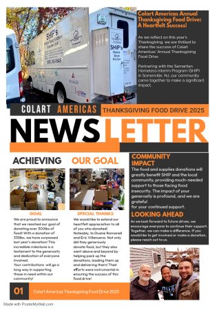 The Wall 4 months, 1 week agoColart Americas proudly celebrated the success of our 2025 Thanksgiving Food Drive, partnering with the Samaritan Homeless Interim Program (SHIP) in Somerville, NJ. Through generous contributions from employees, the initiative provided essential food and supplies to support individuals and families facing food insecurity. This effort reflects our commitment to community impact and demonstrates how collective action can make a meaningful difference. We look forward to continuing this tradition and expanding our outreach in the years ahead. Take a look at the newsletter below for more information and for the exciting news about today’s donation!