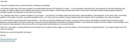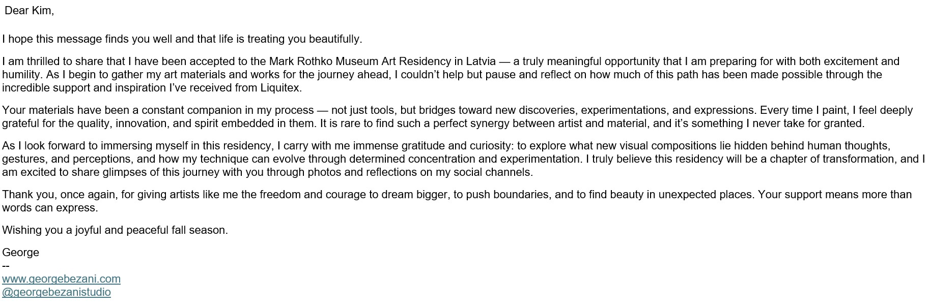 I wanted to take a moment to share a letter I recently received from a former Liquitex Residency Artist, George Bezani. While it was addressed to me, it’s truly meant for all of us – the Liquitex and Colart teams who bring our brand to life every day.George has just been accepted into the Mark Rothko Museum Art Residency in Latvia – a remarkable achievement. In reflecting on his journey, he credited Liquitex as a constant companion and source of inspiration in his creative process. His words are a powerful reminder of the emotional connection creatives can have with our materials, and the role we play in enabling their growth and expression. It brought tears to my eyes, and I hope it inspires you as much as it did me. We can all be proud of the part we continue to play in George’s story – and in the stories of so many artists around the world.——————————–here it is—————————–