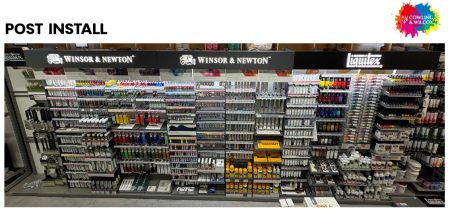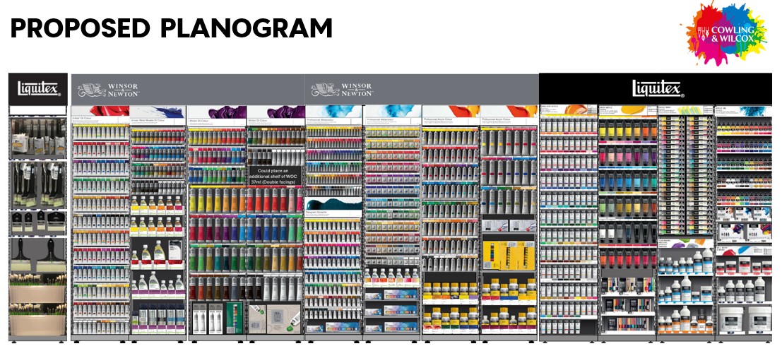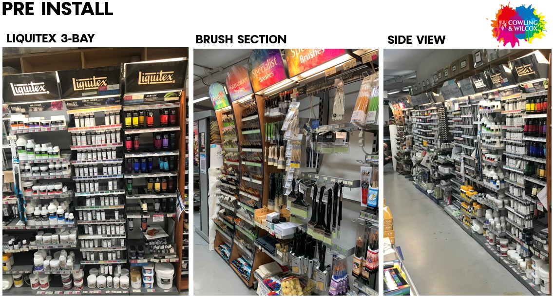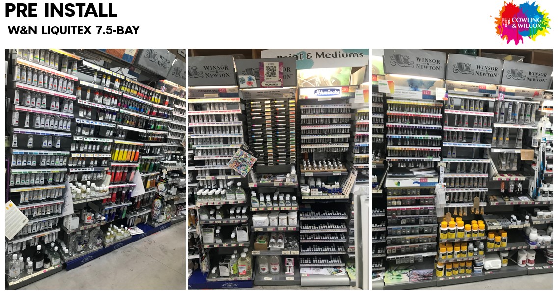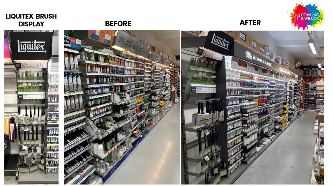 We recently led a comprehensive merchandising refresh at the Cowling & Wilcox store in Shoreditch. Previously, the store featured outdated W&N units and worn-out headers, occupying only 11.5 bays that were frequently disrupted by competitor products. This significantly diminished our brand presence.