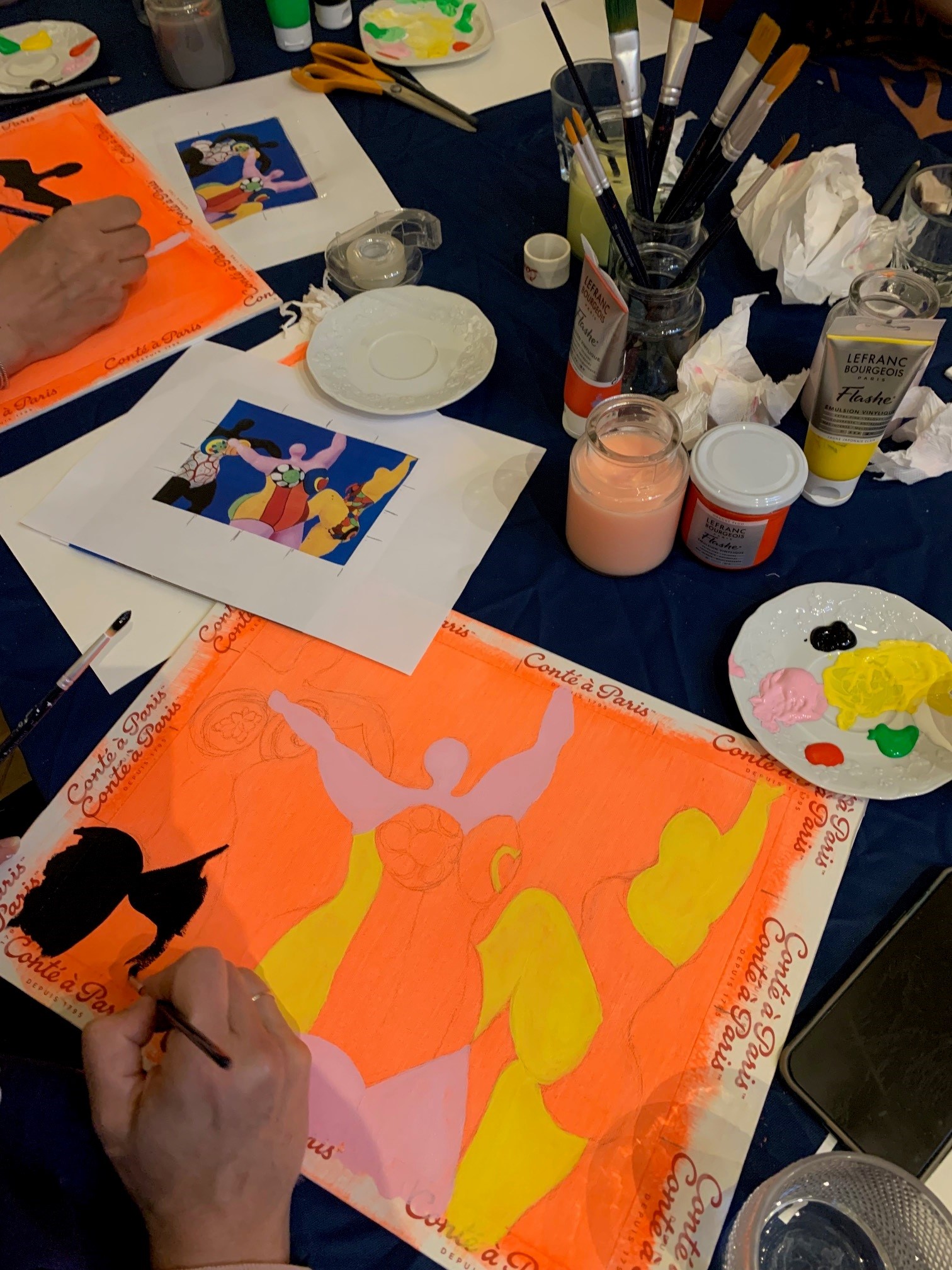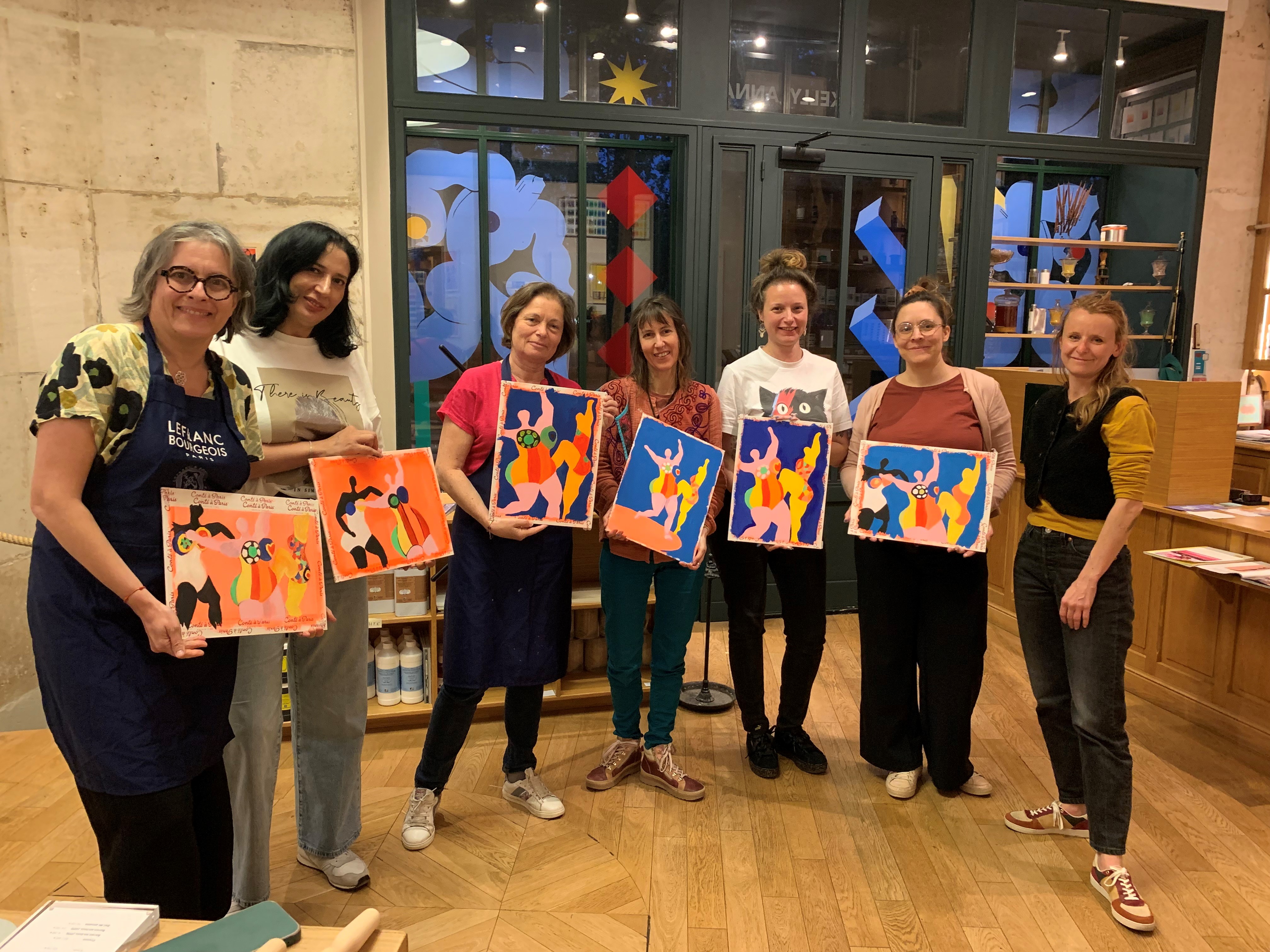 Les participantes à l’atelier Flashe d’hier, animé par l’artiste Diane Benoit du Rey, ont été ravies ! Leurs créations se sont distinguées par des cadrages originaux et soigneusement réfléchis. Et bien sûr, les couleurs éclatantes étaient au rendez-vous, fidèles à l’essence même de la peinture Flashe;). Elles ont été très honorées de faire cet atelier dans la boutique Charbonnel, là où Picasso, Pissarro, Degas et bien d’autres venaient s’approvisionner en matériel d’art au début du 20è siècle et évidemment très intéressées par l’histoire de la Flashe, cette peinture iconique qu’utilisait Niki de Saint Phalle. Deux journalistes étaient présentes à cet atelier, l’Œil et RTL, ce qui nous donnera peut-être l’opportunité de futurs articles pour faire rayonner nos ateliers et l’histoire de nos marques!