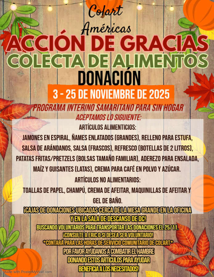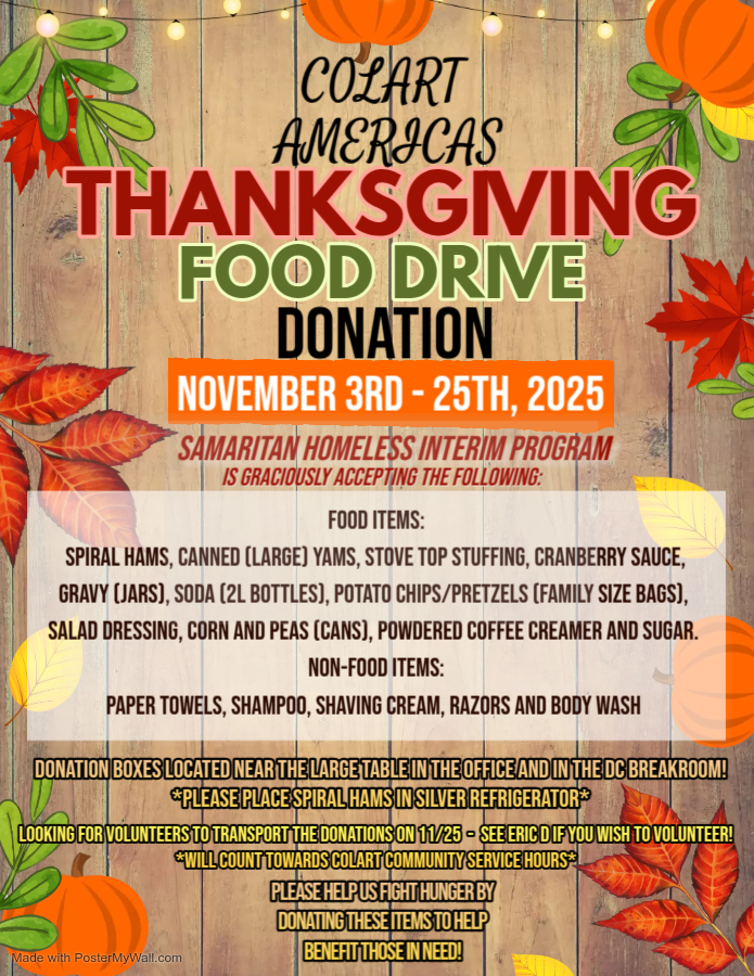 Let’s show the strength of our Colart community and the power of giving! Last year we donated 300 lbs of food and I know we can donate more this year! Every contribution counts.