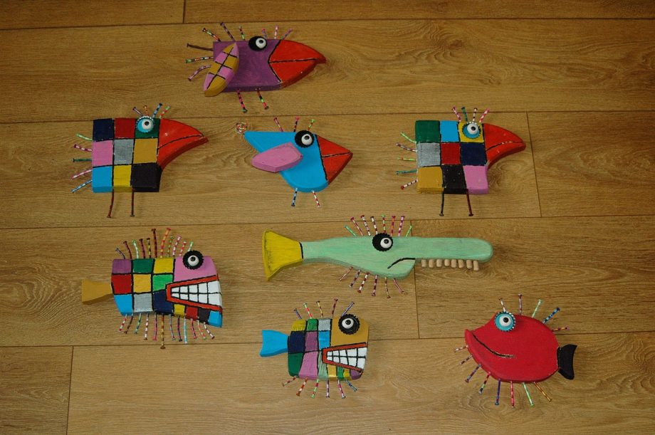 …and even random small offcuts can be made into something. Here are some creatures I made with odd pieces that were lying around, some nails, bottle tops, nail varnish and Reeves paint.