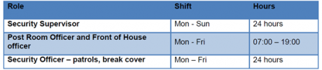 The Security Room is manned as follows: