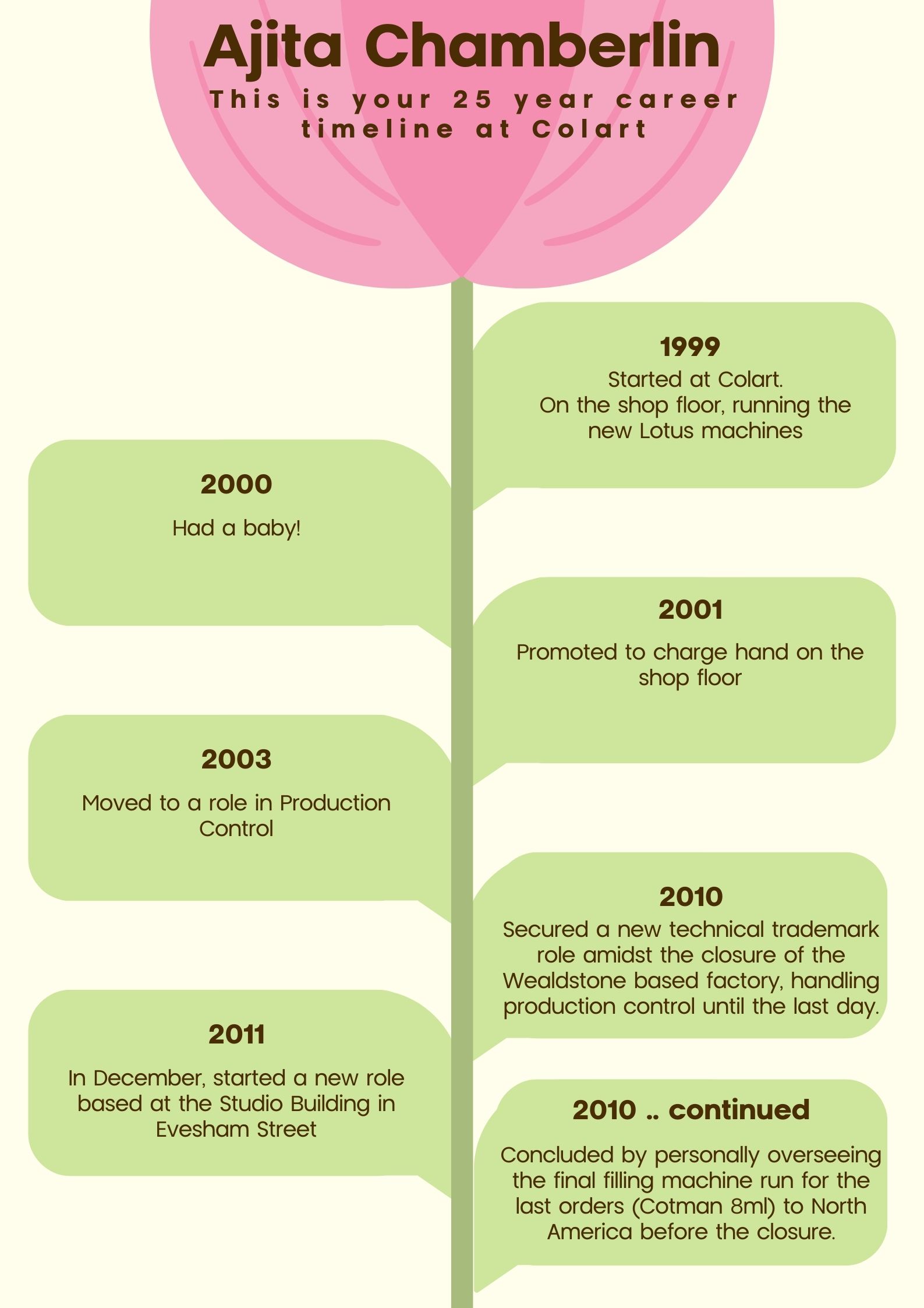 In 2011, faced with the closure of the factory, Colart recognised Ajita's value and expertise, leading her to a new role managing Trade Marks. Her professionalism and organizational skills brought a new level of control to the department. Ajita's willingness to go beyond her designated responsibilities became apparent as she took on additional roles, particularly in supporting our sustainability goals.