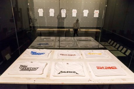 The work made by Juan Bolivar during his week consisted of creating a series of t-shirts (using Liquitex acrylic paint and mediums) merging the names of Bauhaus artists and rock band names.