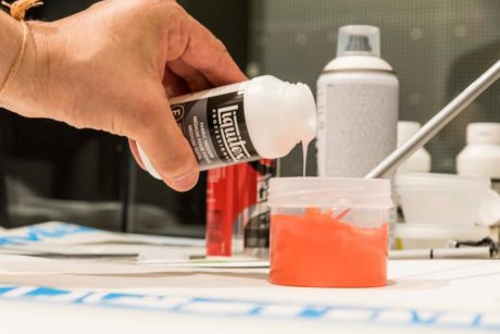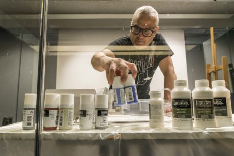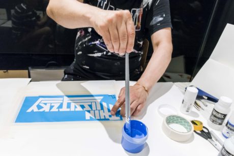The residency was a chance to test what Liquitex mediums worked best with Soft Body and Heavy Body acrylic for the purposes of these t-shirts and works on paper. Not surprisingly, Liquitex’s Fabric Medium worked the best for t-shirts; allowing the Soft Body acrylic to soak into the fabric creating an even flexible paint film.