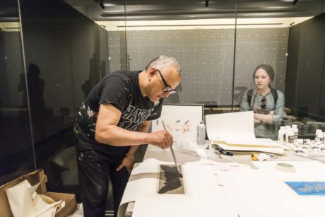 For a residency an Atelier is provided, (one of four studios inhabited by artists). Artist residencies tend to be periods which offer artists self-reflection and introspection, but the nature of this one-week residency meant that it was ‘go’ from the start. Designed for the benefit of visitors, the large studios contain within them a raised platform stage surrounded by three glass walls, which allow the viewer to see the artist at work and engage in conversation about the work being made.
