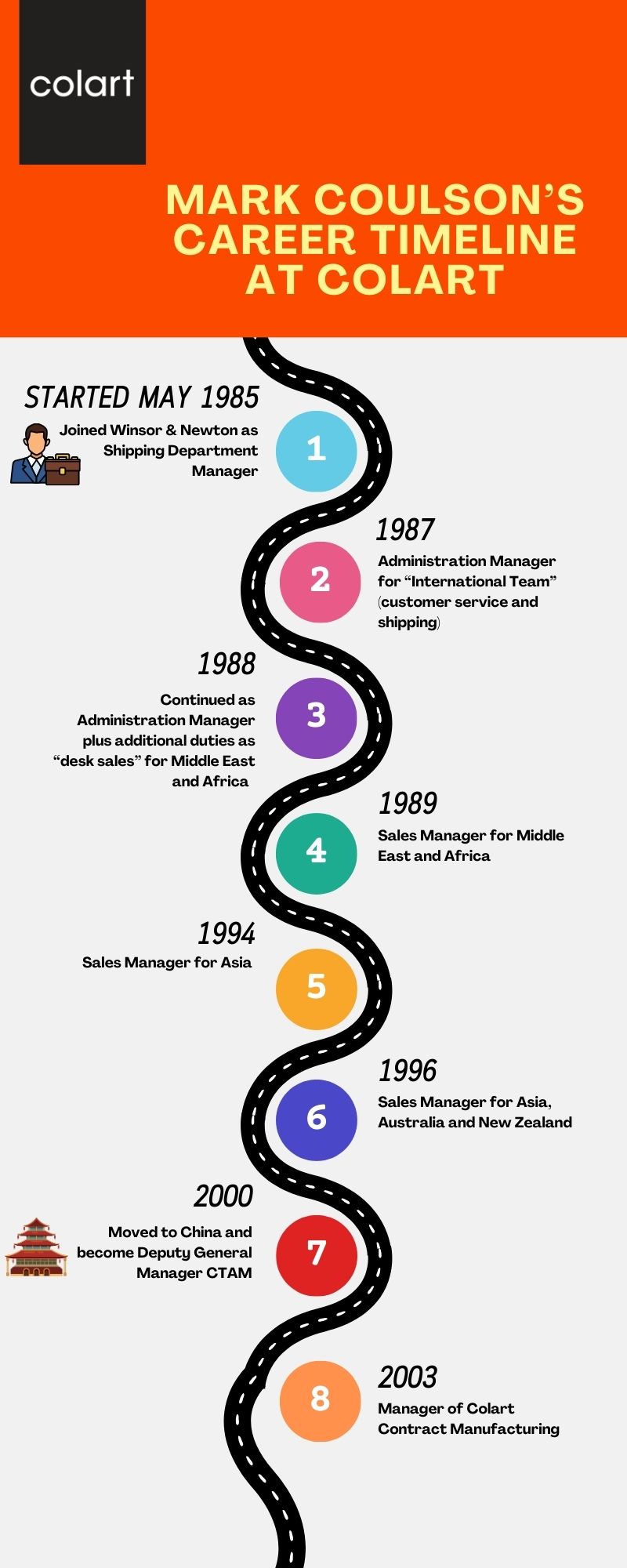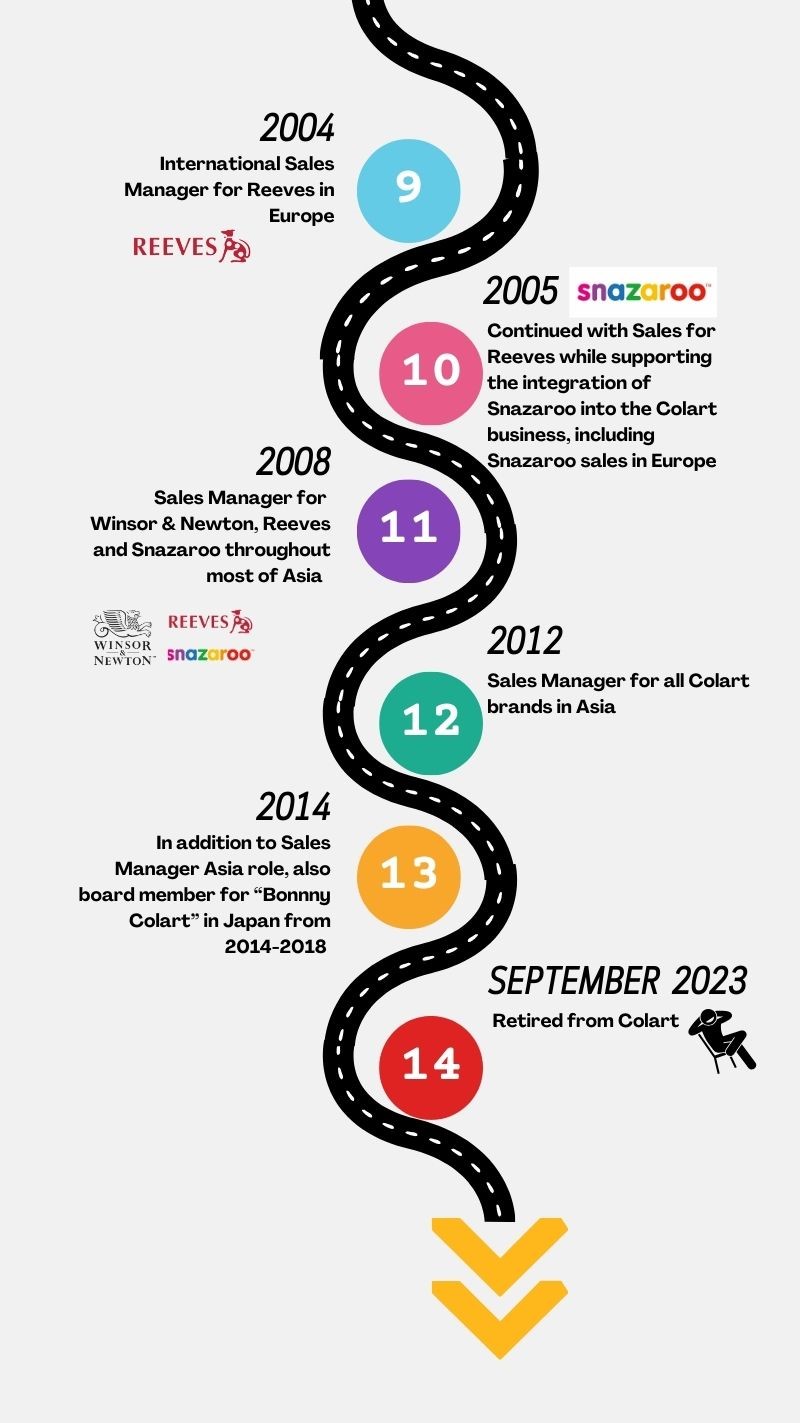 1. Wonderful stories Mark and a fabulous career with Colart! You are truly an ambassador of both our values and the business and above all I love your advice to people – “talk to people and build relationships”. You are so right which is why I’m so pleased that you have agreed to stay as a mentor for Colart – we won’t lose your wise counsel and expertise.