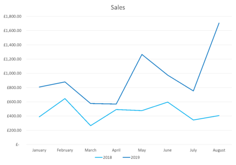 The impact is clear, when brand pages and ranges were established sales jumped, for example here are the sales 2018 vs 2019. We can clearly see two jumps, one in April/May 2019 where the entire catalogue was uploaded and one in July/August 2019 when the brand page was created on Amazon.
