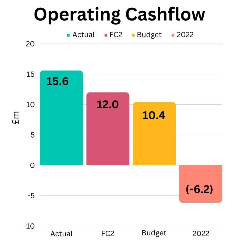 OCF was £15.6m (£21.8m favourable to 2022) driven by:
