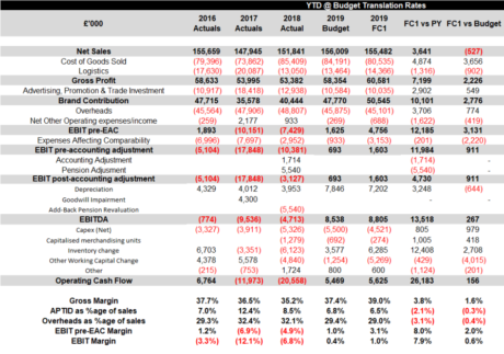 The first thing to note is that 2019 Budget has been restated for the impact of IFRS 16 which creates fixed assets and multi-year liabilities for what were previously called operating leases. This change has no overall cash impact though it does impact the different dimensions of cashflow reporting. EBIT is restated to £0.69m from £0.27m and OCF restated from £2.44m to £5.47m.