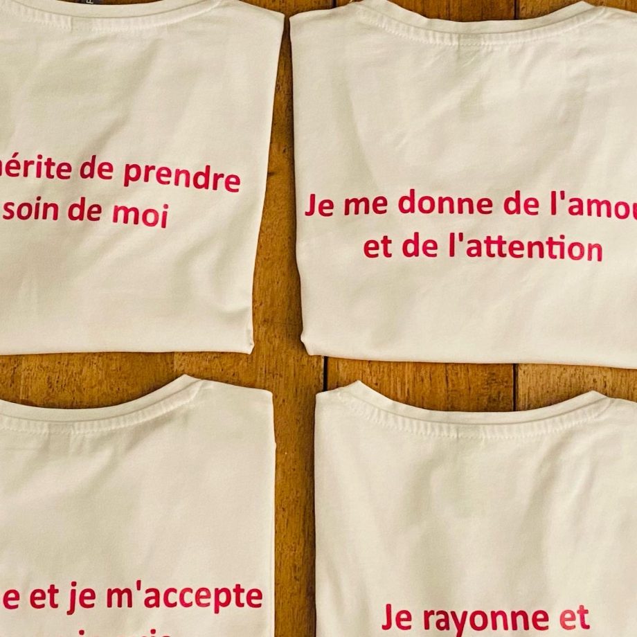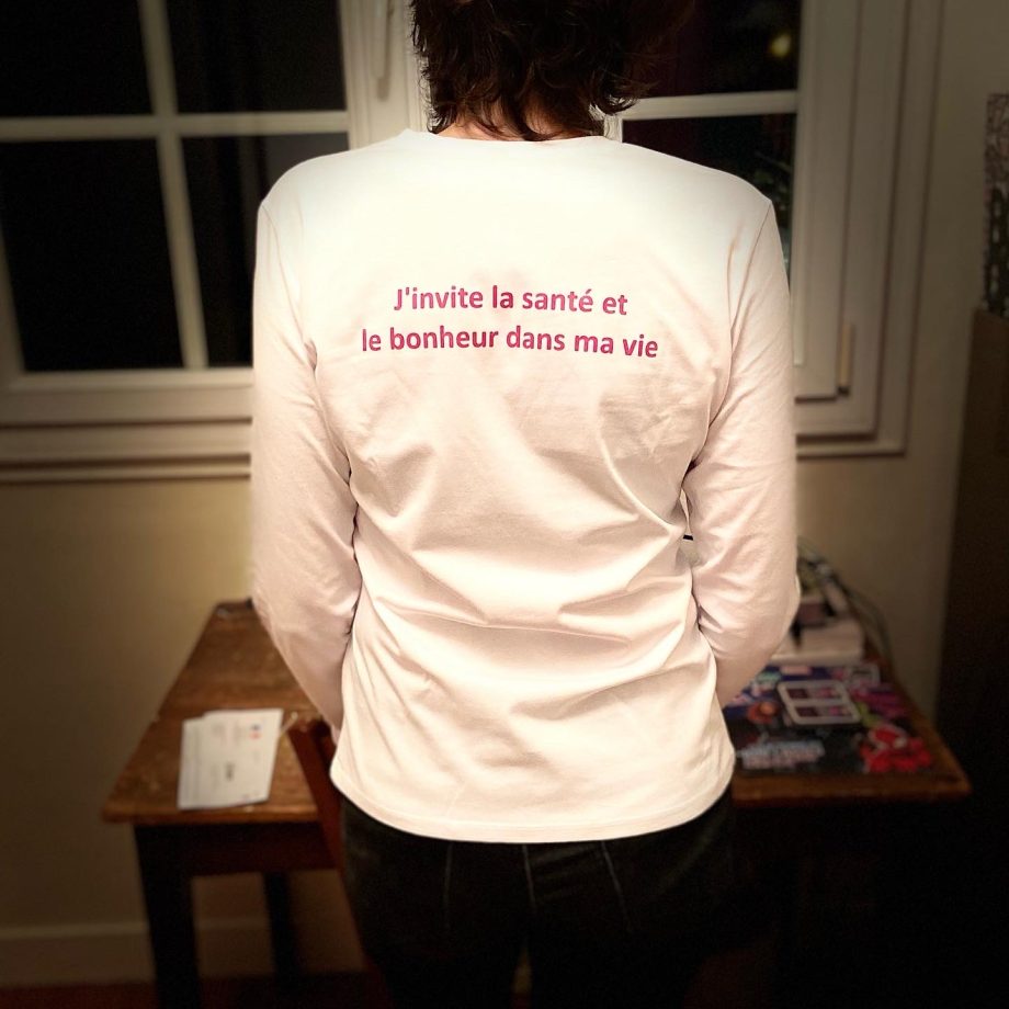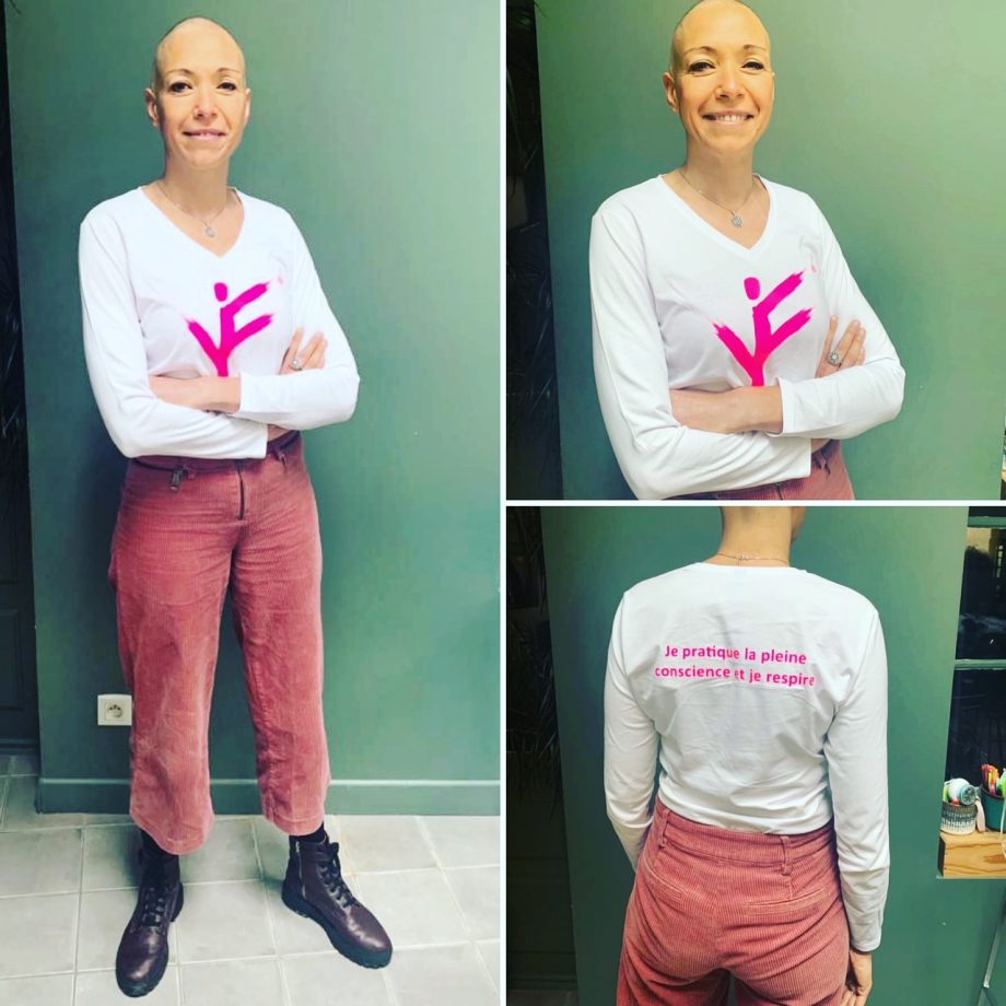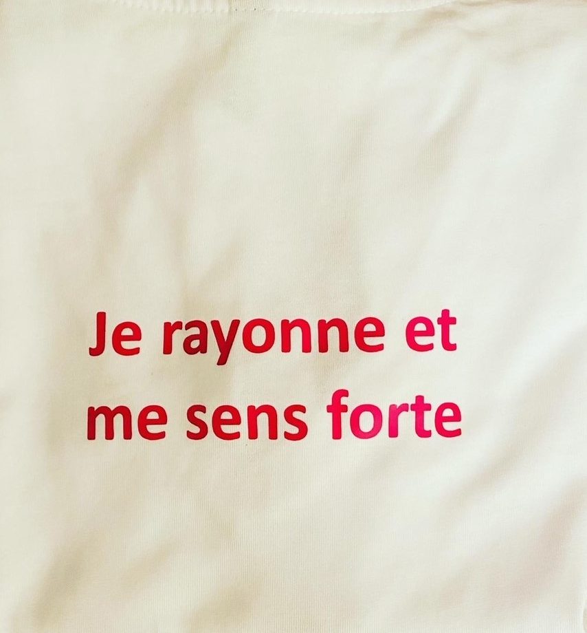 Enfin, j’ai eu besoin de créer des t-shirts avec ma marque IFY (Instinct Follow Yours) : IFY sur le devant et un message tel que « je rayonne et me sens forte » qui me donne courage et force avant chaque chimiothérapie. 1 t-shirt différent par séance. Je choisis méticuleusement celui qui correspond à mon besoin de moment. D’ailleurs, les infirmières sont à chaque fois impatientes de découvrir le nouveau message du jour !