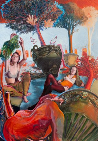 Enzo says “My practice is about the painter’s frustration in front of paintings, its history, the space it has today and maybe its exhaustion. Starting with large panels of historical paintings, I built up a universe that includes the camp, queer and kitsch universes, with some irony. This is where I am today, exploring and playing with art.”