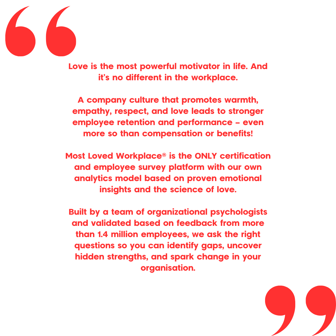 We see the Most Loved Workplace certification as a great indicator of whether we are living up to this commitment and for this reason we are looking to renew our certification. Seeking your feedback is key to this.