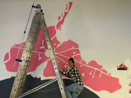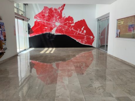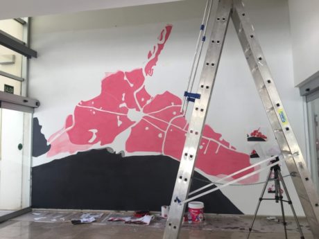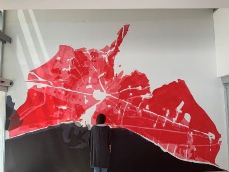 Lluïsa: The mural consists of the overlaying of four cartographies, of different historical periods in which you can appreciate the expansion of the city of Valencia at the expense of the surrounding garden. The pictorial technique used was the superposition of flat masses of acrylic paint, correlative to each century, and gradually diluted with acrylic medium fluid and matt, in order to create glazes that make new shades on the wall and endow it with depth.