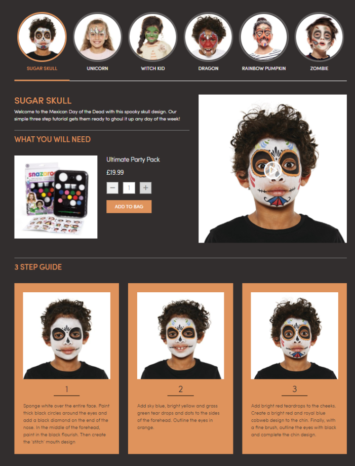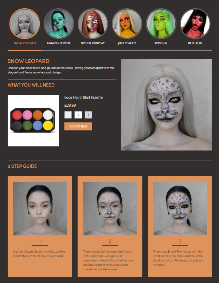 There are also some novelties, such as new product range shots, an Instagram feature on the homepage, which means a seamless integration between our social media channels and the shopping experience. There are also 6 brand new on trend how-to-guides, so with the new launch you can find new and improved ways to get creative with our face paint.