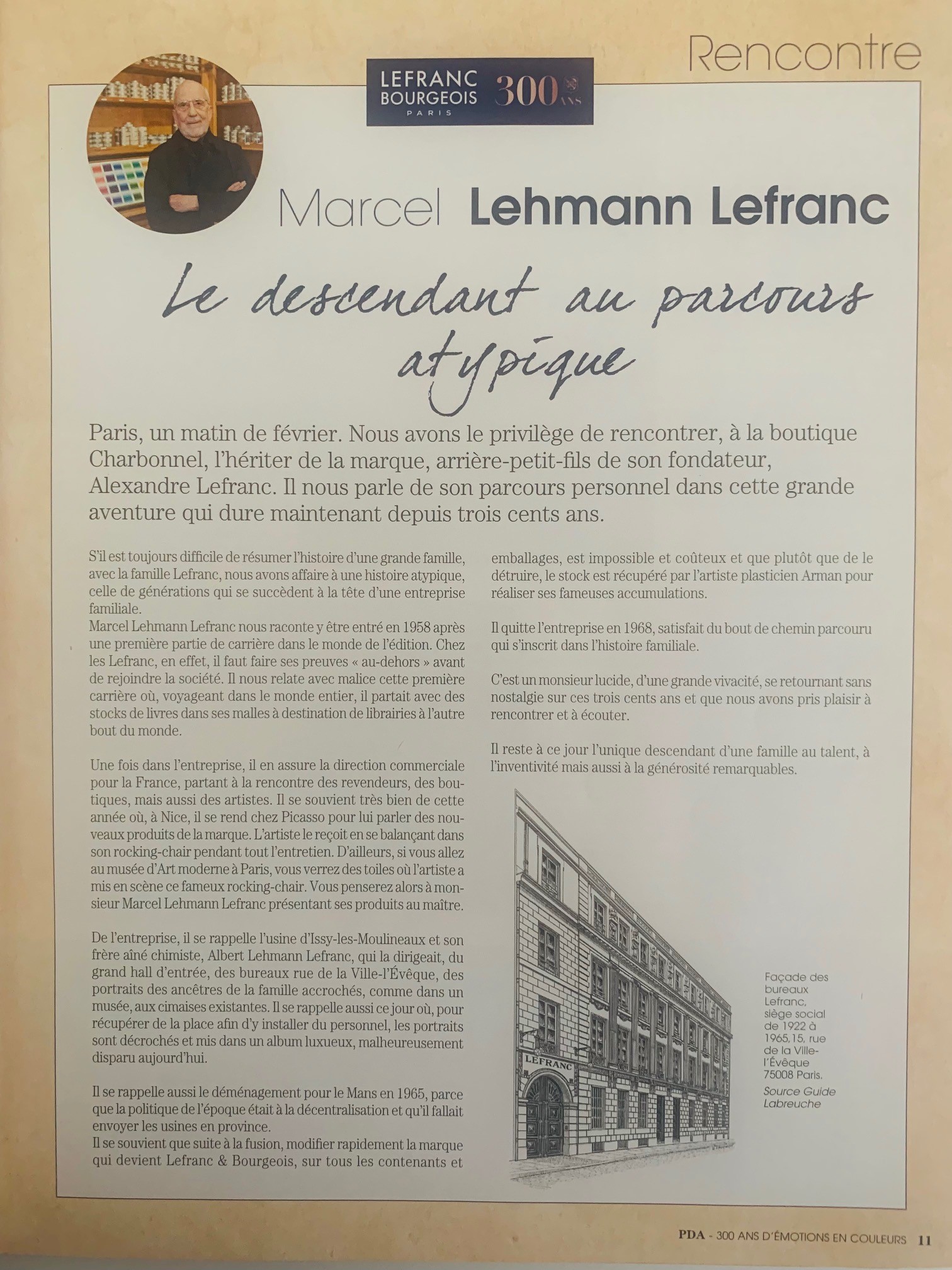 Mr. Lefranc's influence on the art world and the company was monumental. Together with his brother Albert, he managed the company's strategic move from Paris to Le Mans and orchestrated the merger with Bourgeois in the 1960s. His innovative approach to marketing, especially his work with artists and art schools, left an indelible mark. I will never forget his establishment of the Lefranc Prize for Young Artists and his incredible collaborations with luminaries such as Picasso, Soulages, Arman, Buren, Dubuffet, Viallat, and Giacometti.