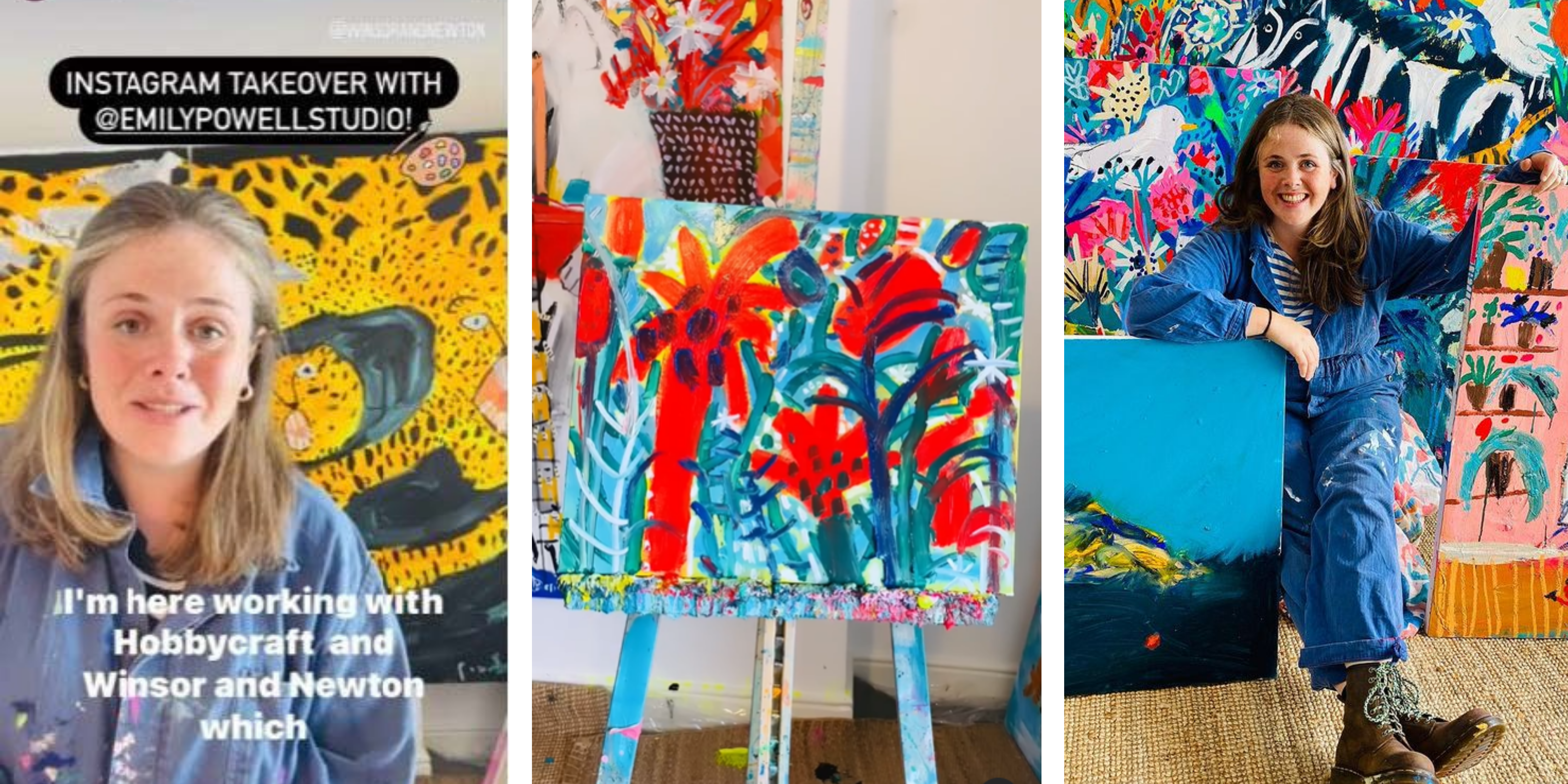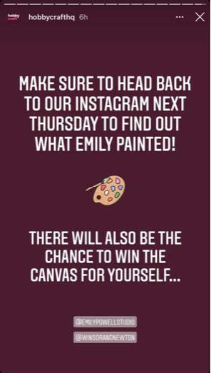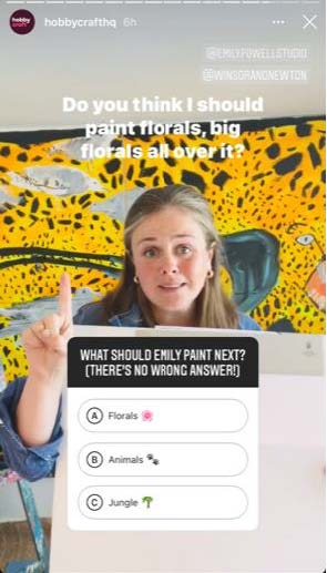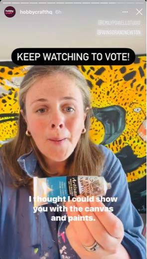 Emily introduced the Hobbycraft consumer to her art studio in Devon and talked about the collaboration with Winsor & Newton and Hobbycraft. She then announced that she would create a canvas in the following week with Winsor & Newton products and that Hobbycraft consumers could decide the topic with the voting option in the Instagram story.