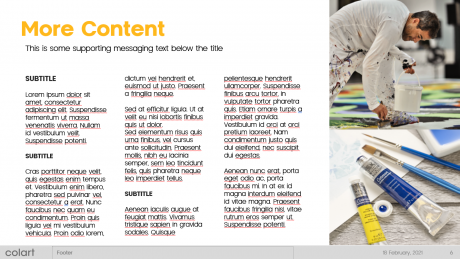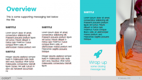 We are delighted to announce the launch of the new Colart PowerPoint template. The new template is designed to give a fresh look with more usable space on each slide and uses and newly introduced company font. To help speed up building your presentation we have also built out a library of premade slides that you can customise to your own needs.